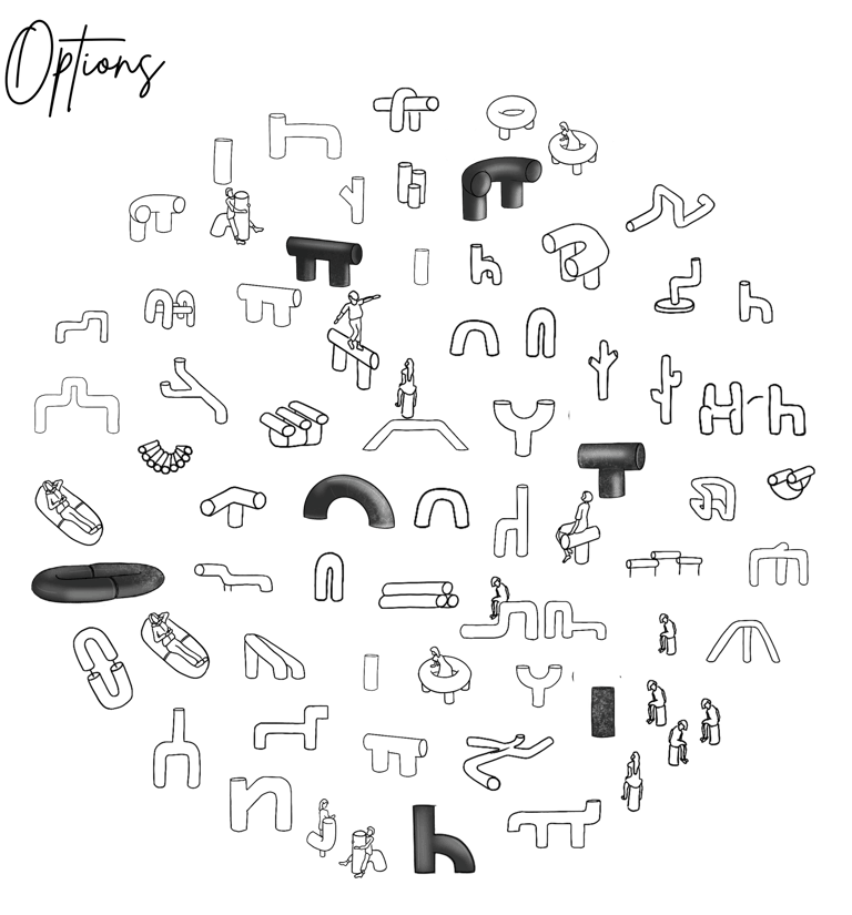 While researching the shapes and effects of children's playgrounds, I used oval abstract shapes for the creative process, which would encourage children to move and explore. Also, sustainable materials and eco-friendly design: teaches children about sustainability, caring for the environment, and conserving resources.